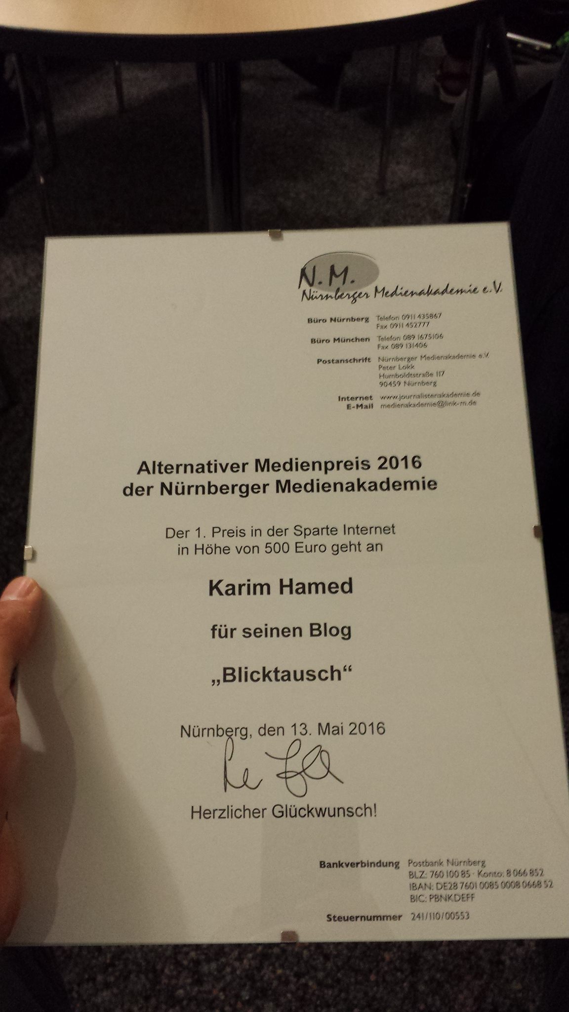 Herzlichen Gückwunsch zum Preis lieber Karim,