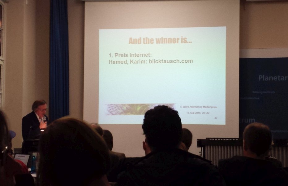 Am Freitag, wurde mir für den Blog Blicktausch.com der erste Preis in der Kategorie Internet des alternativen Medienpreises 2016 verliehen. Es ist mir eine Ehre zu den Preisträgern zu gehören und ich freue mich, dass damit meine Arbeit gewürdigt wurde.