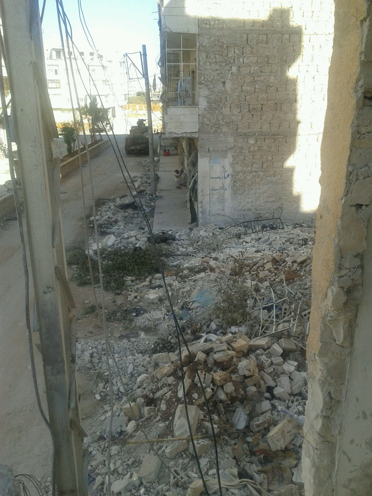 Ich stand auf der Straße. Mitten in einem Trümmerfeld. Das Regime hatte eine Kontainerbombe – ähnlich einer Fassbombe, nur größer – über unser Wohngebiet abgeworfen. Die Häuser standen teilweise noch, jedoch waren alle Fassaden verwüstet. Während ich geistesabwesend den Anblick betrachtete, hörte ich plötzlich eine Frau meinen Namen rufen. Es war meine Schwester, die im Haus gegenüber wohnte. Ich eilte zu ihr. Sie gab mir ihren drei Monate alten Sohn und bat mich, ihn in Sicherheit zu bringen. Ein Freund brachte meine Schwester mit ihrem Sohn schließlich zu sich nach Hause und versprach mir, sich um sie zu kümmern.